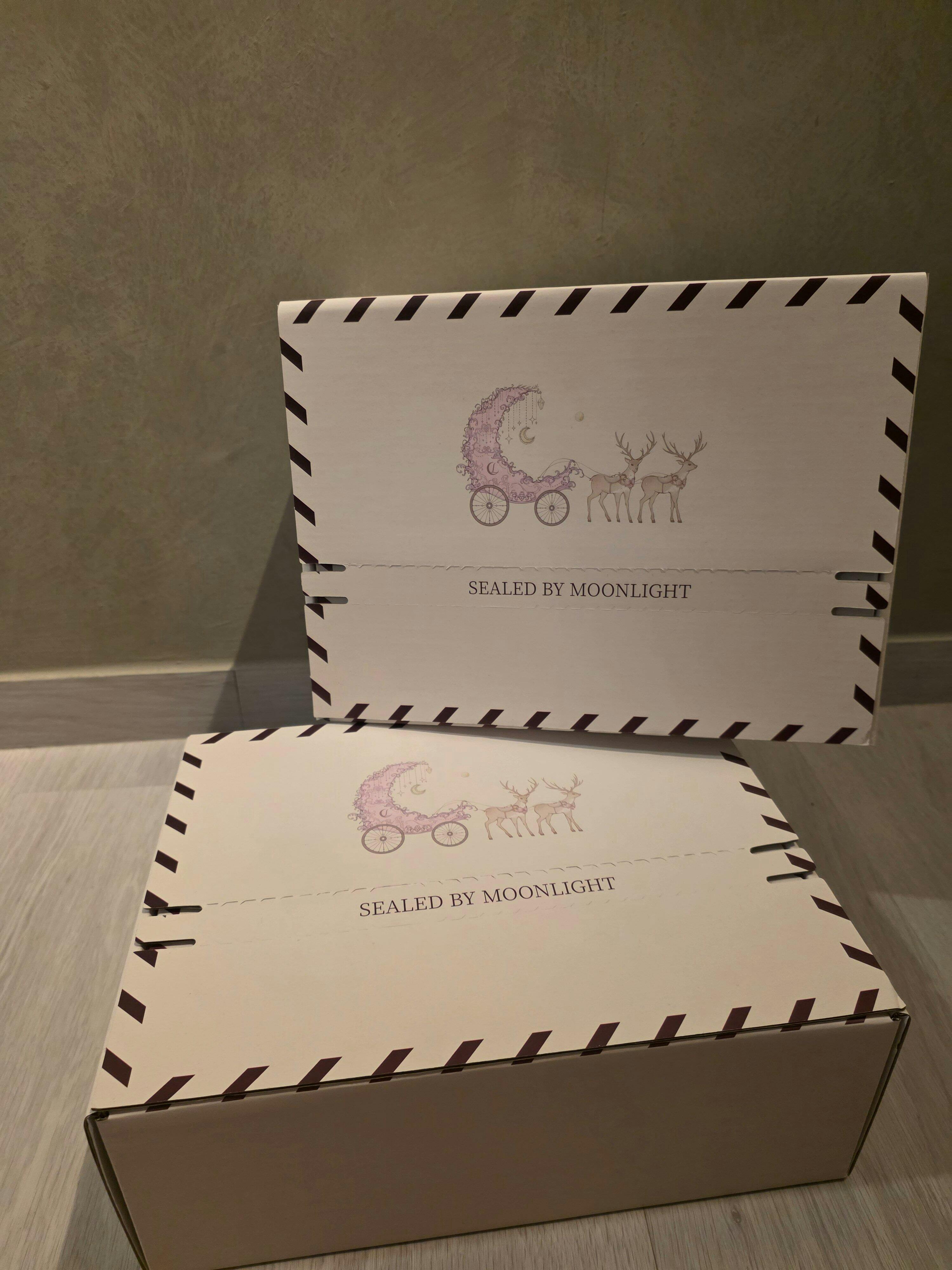 Each order arrives in our signature moonlit packaging: layers of soft parchment tissue, a gold-embossed certificate of authenticity, and your silk piece enclosed within an airplane-style tear-zip box — sealed like a letter from the moon.